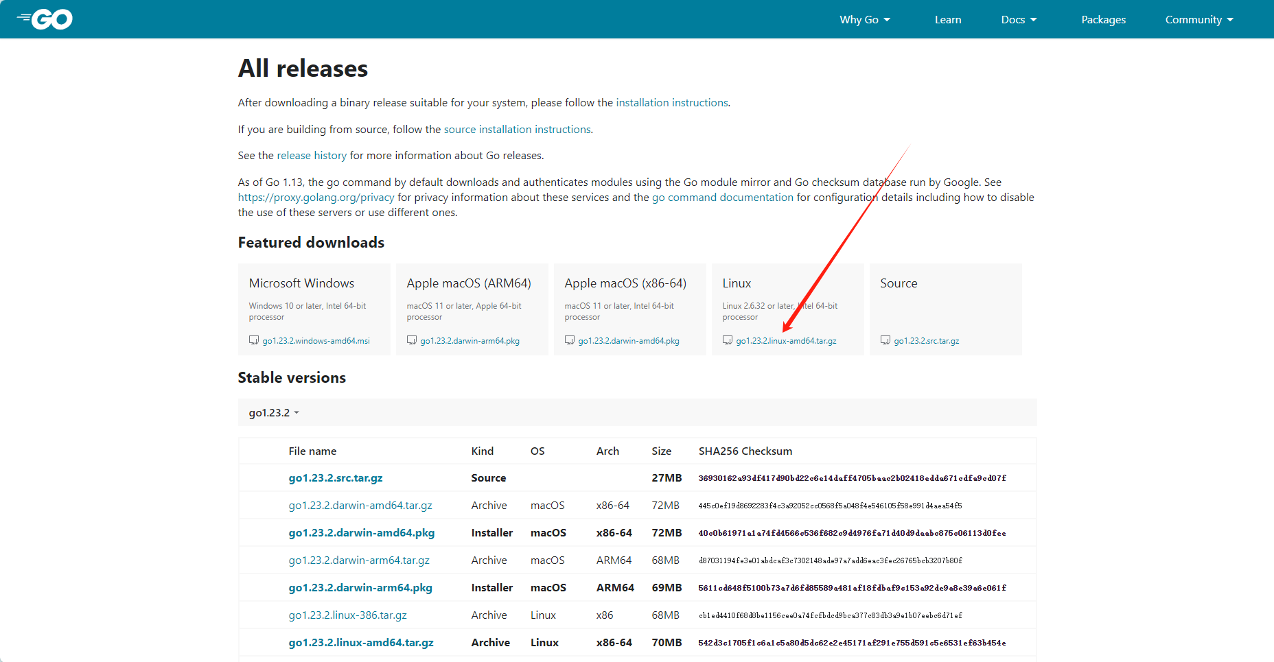 1. 官网(https://go.dev/dl/)下载安装包(需翻墙):