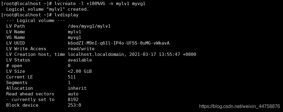 lvcreate -l +100%VG -n mylv1 myvg1创建逻辑卷(LV),将vg所有空间分配给lv,也可用lvcreate -L 2G -n mylv1 myvg1分配指定大小空间,lvdisplay查看所有逻辑卷