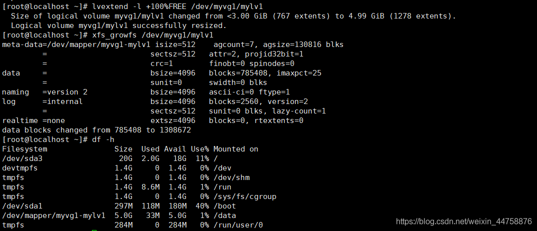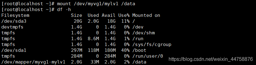 mount /dev/myvg1/mylv1 /data挂载到/data目录下,通过df -h查看挂载成功