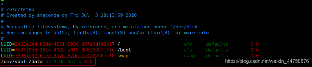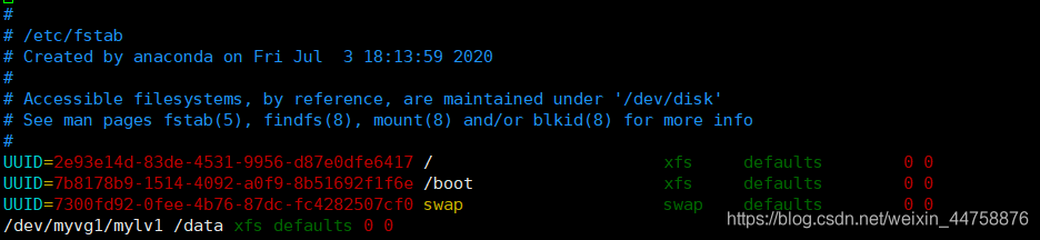 vim /etc/fstab添加/dev/myvg1/mylv1 /data xfs defaults 0 0实现自动挂载