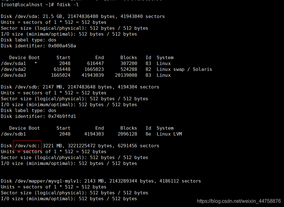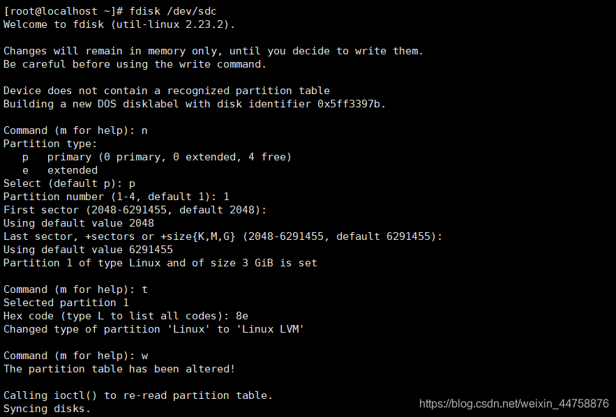 fdisk /dev/sdc为硬盘创建分区,依次输入n,p,1,t,8e,w,其中n分别表示创建一个新分区,p表示分区类型为主分区,1表示分区编号是1,t表示修改id标记,8e表示改为lvm,w表示保存