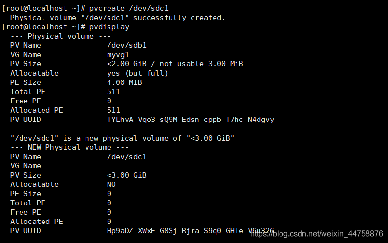 pvcreate /dev/sdc1创建物理卷(PV),pvdisplay查看所有物理卷