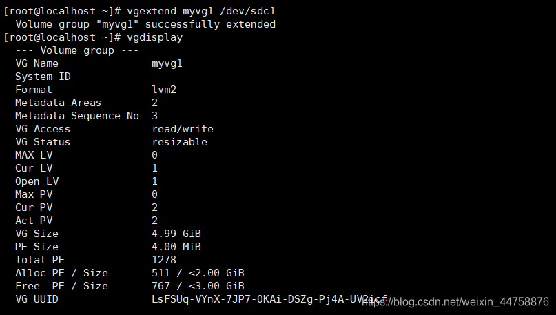 vgextend myvg1 /dev/sdc1将/dev/sdc1加入到myvg1,vgdisplay查看所有卷组