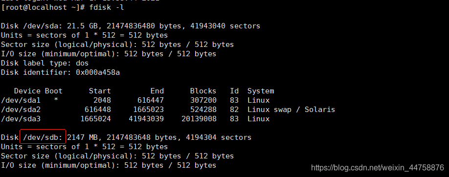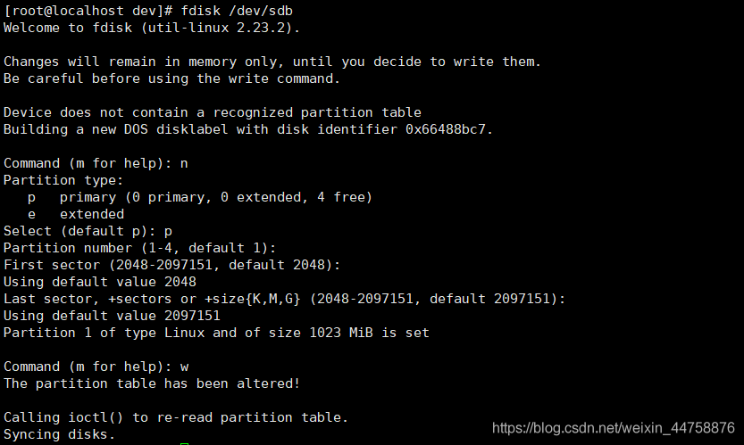 fdisk /dev/sdb为硬盘创建分区,依次输入n,p,1,w,其中n分别表示创建一个新分区,p表示分区类型为主分区,1表示分区编号是1,w表示保存