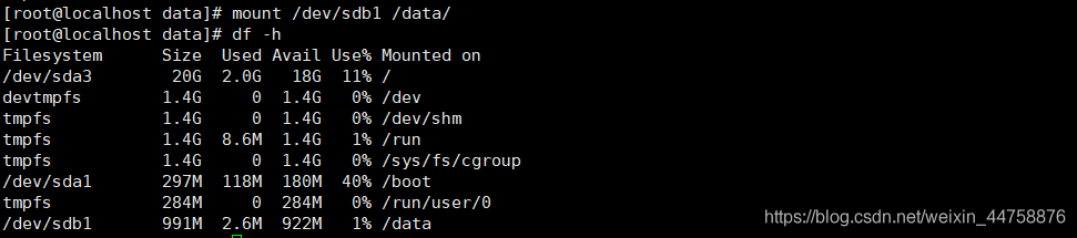 mount /dev/sdb1 /data,将分区挂载到/data目录下,通过df -h可以看到挂载成功