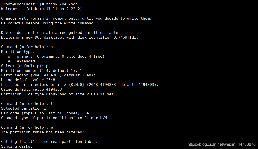 fdisk /dev/sdb为硬盘创建分区,依次输入n,p,1,t,8e,w,其中n分别表示创建一个新分区,p表示分区类型为主分区,1表示分区编号是1,t表示修改id标记,8e表示改为lvm,w表示保存
