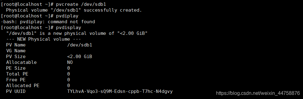 pvcreate /dev/sdb1创建物理卷(PV),pvdisplay查看所有物理卷