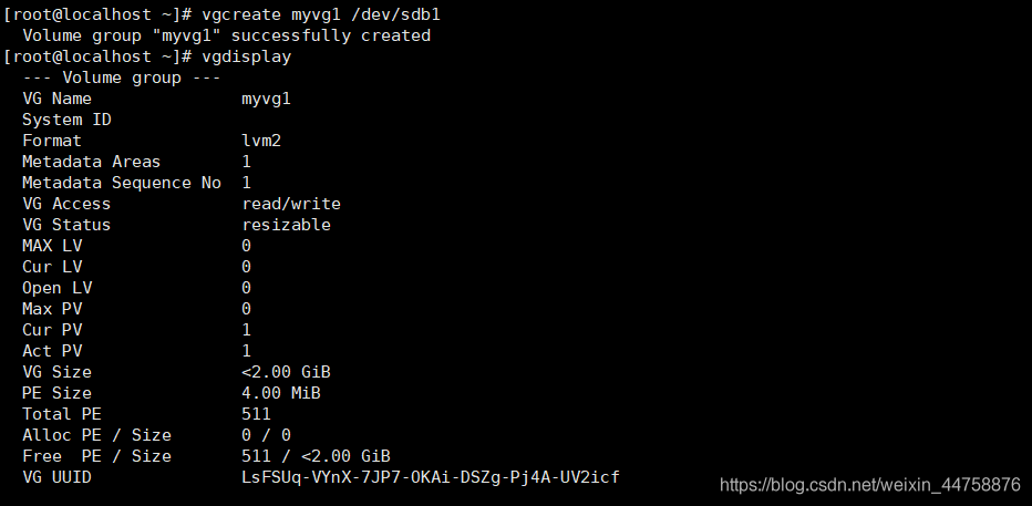 vgcreate myvg1 /dev/sdb1创建卷组(VG),vgdisplay查看所有卷组