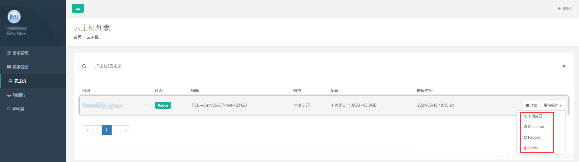 - 在“云主机”菜单中,还可以点击“更多操作”,这里可以做申请更多端口、关机、重启、删除等操作