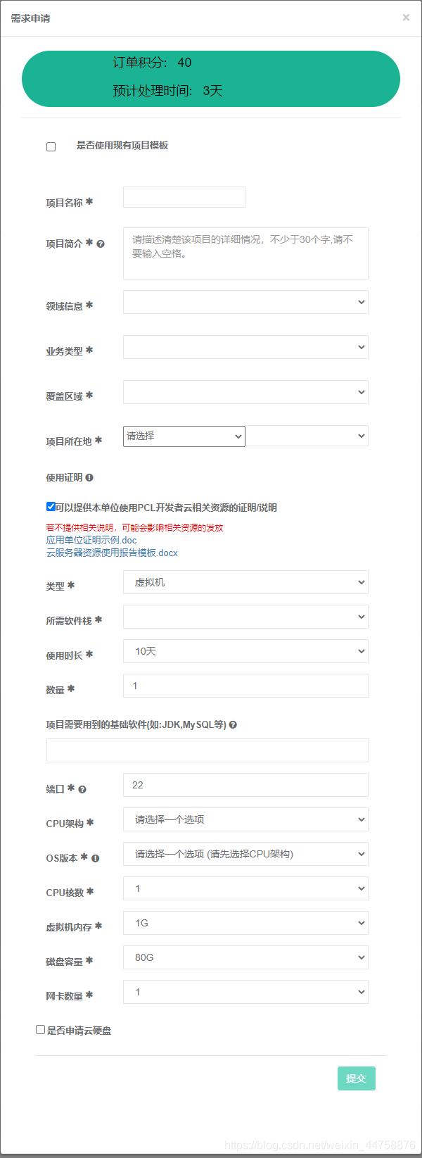 - 点击之后会出现申请详情,根据自己的需要填入需要申请的资源,填写完毕,点击“提交”