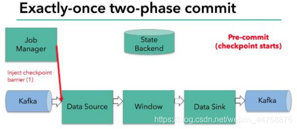 sink 任务首先把数据写入外部 kafka,这些数据都属于预提交的事务(还不能被消费);当遇到 barrier 时,把状态保存到状态后端,并开启新的预提交事务。