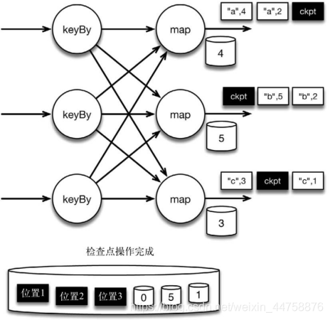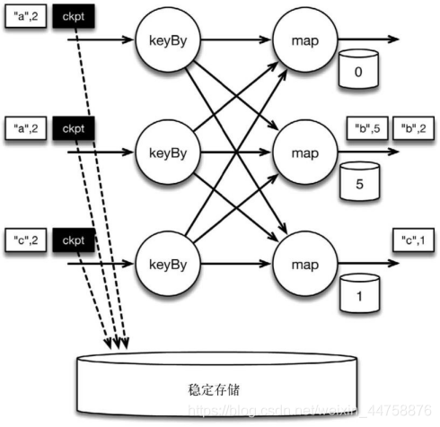 上图是程序的初始状态。注意,a、b、c 三组的初始计数状态都是 0,即三个圆 柱上的值。ckpt 表示检查点分割线(checkpoint barriers)。每条记录在处理顺序上 严格地遵守在检查点之前或之后的规定,例如[“b”,2]在检查点之前被处理,[“a”,2] 则在检查点之后被处理。