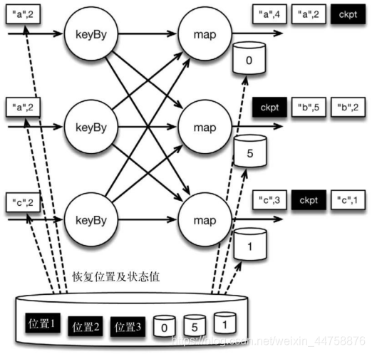 下图展示了这一重新处理过程。从上一个检查点开始重新计算,可以保证在剩 下的记录被处理之后,得到的 map 算子的状态值与没有发生故障时的状态值一致。