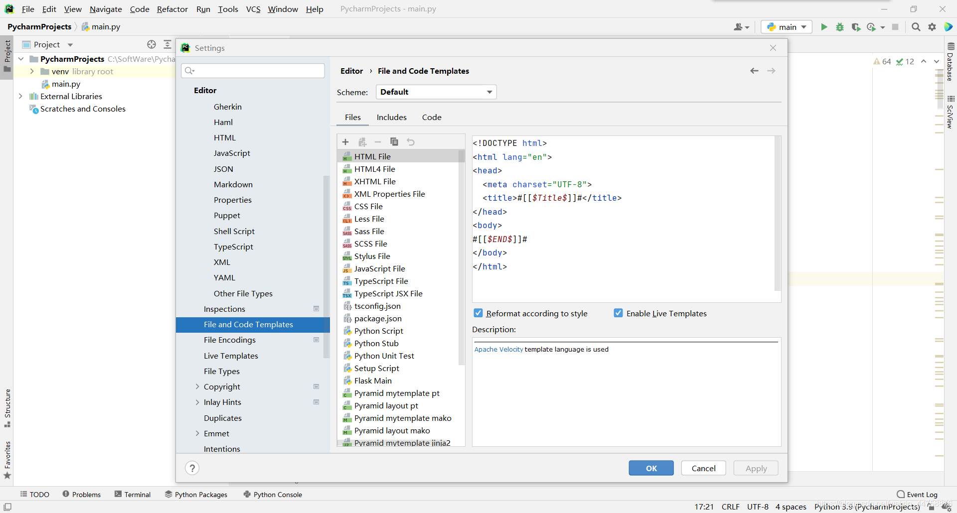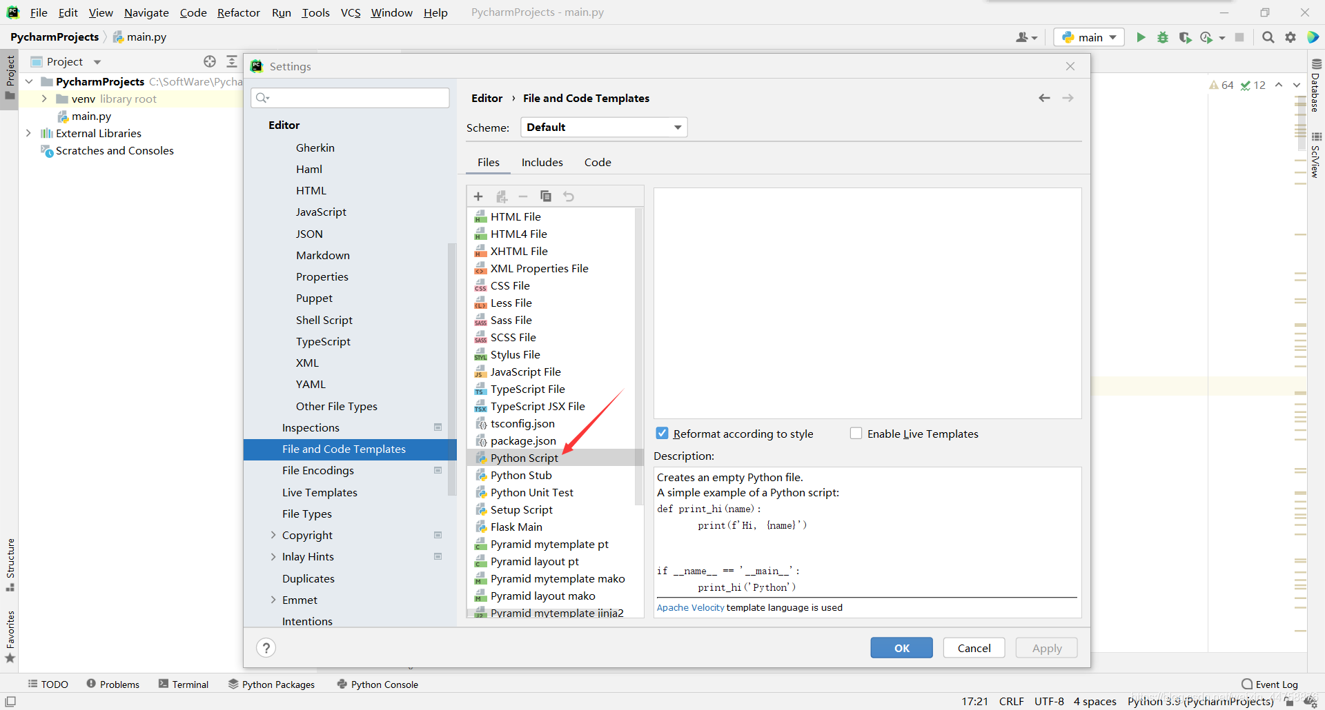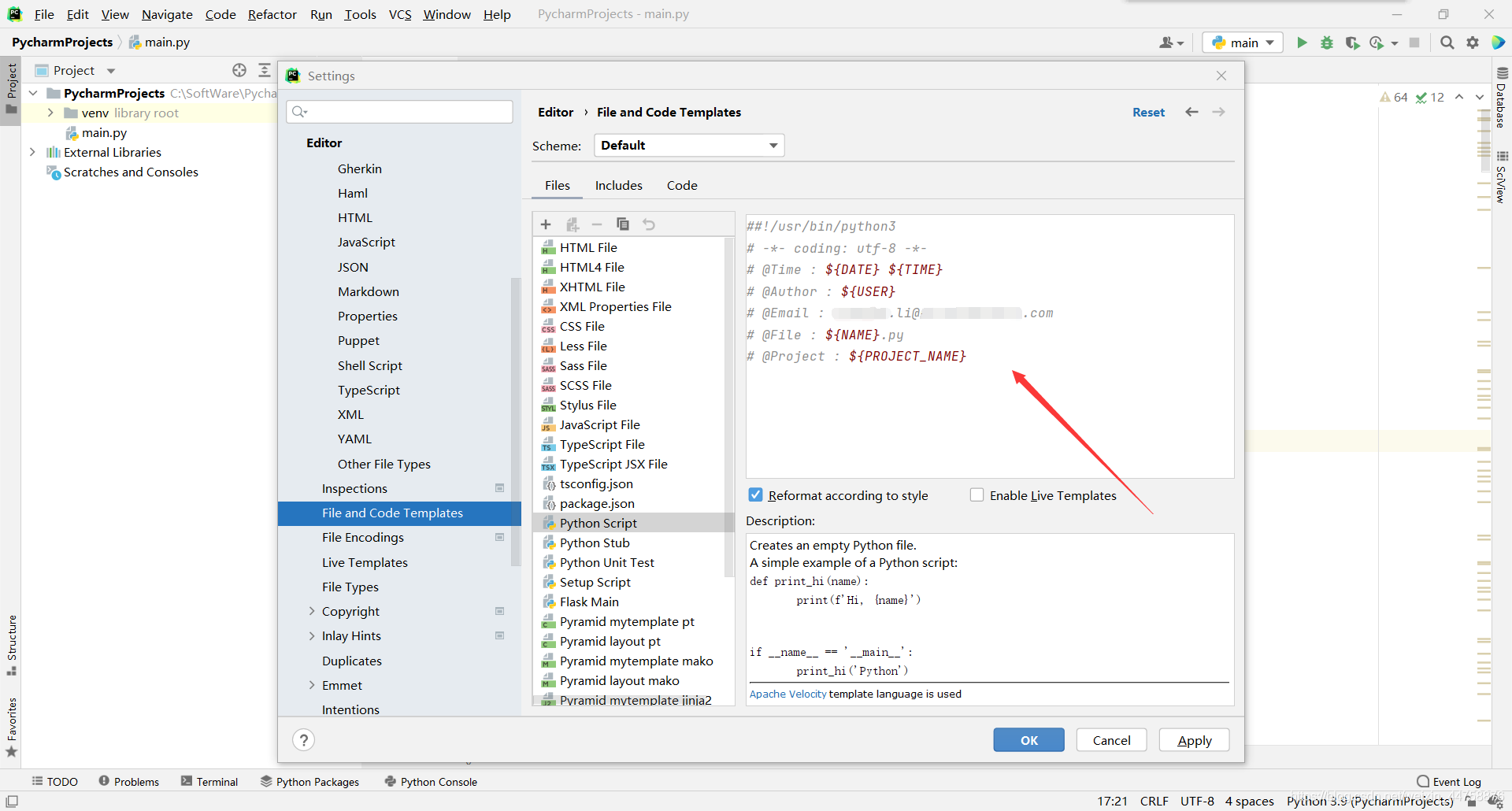 File,选择Settings(快捷键:【ctrl】+【Alt】+【s】)Editor,选择File and Code Templates