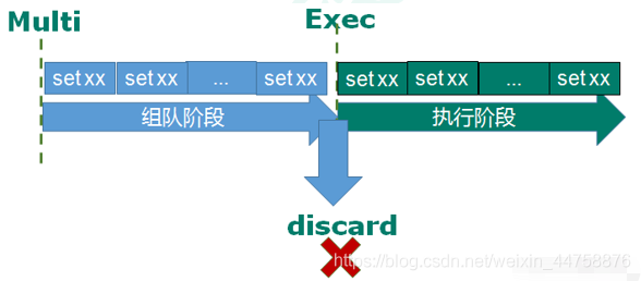 从输入Multi命令开始,输入的命令都会依次进入命令队列中,但不会执行,直到输入Exec后,Redis 会将之前的命令队列中的命令依次执行。