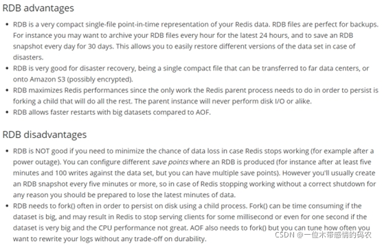 • RDB 持久化方式能够在指定的时间间隔能对你的数据进行快照存储