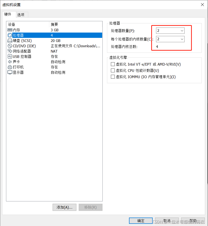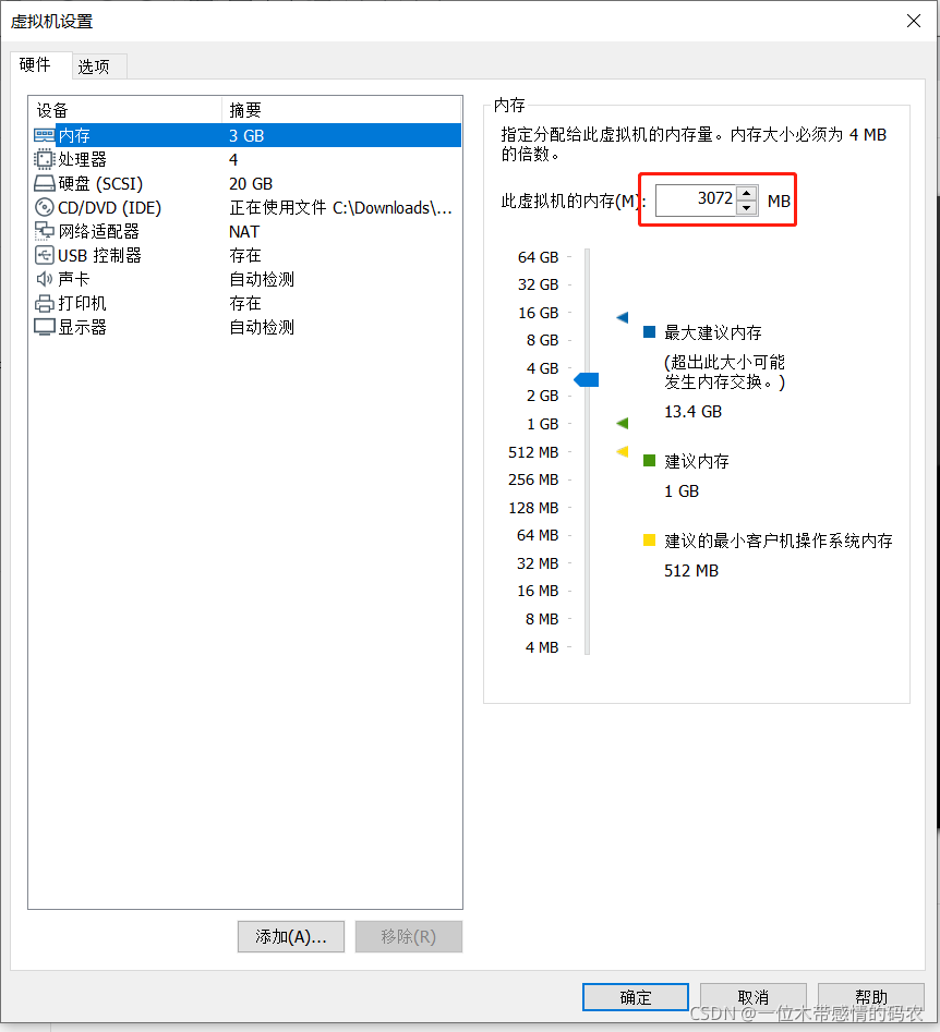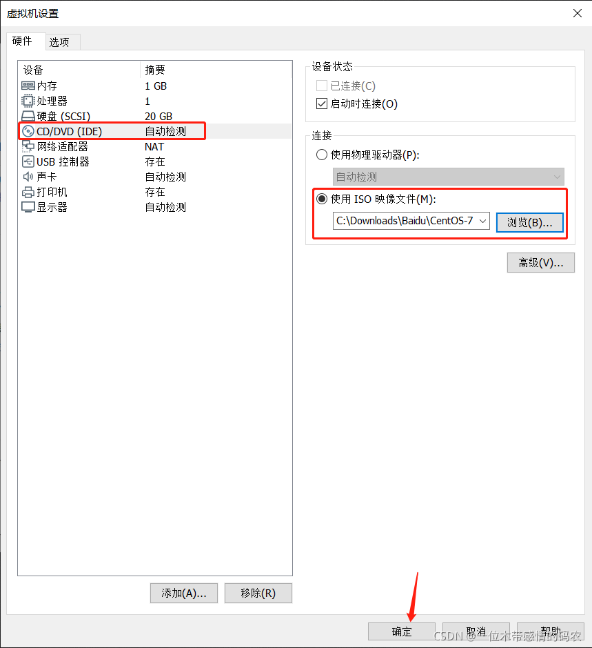 CD/DVD(IDE)选项——使用ISO映像文件,指定DVD镜像路径——点击确定
