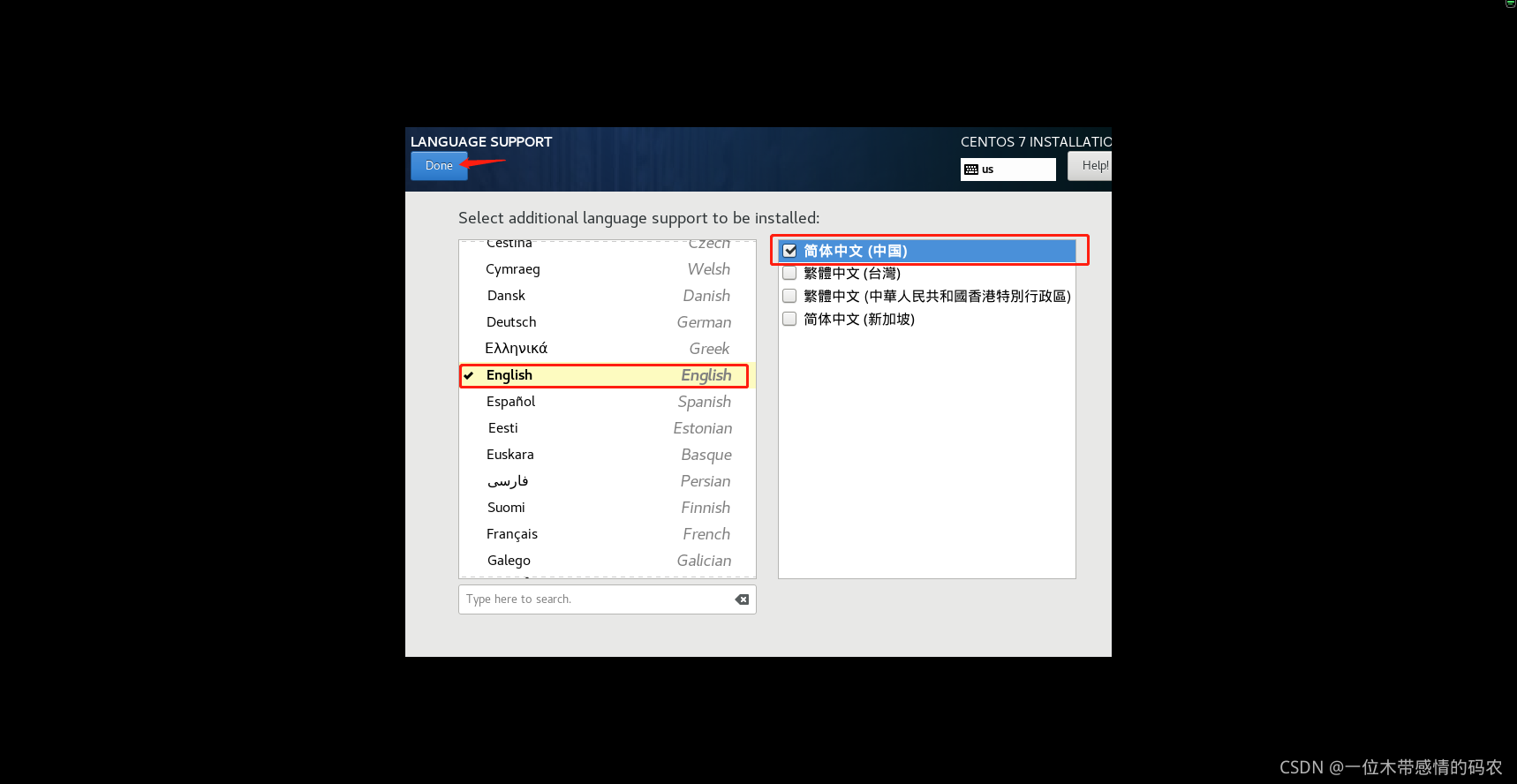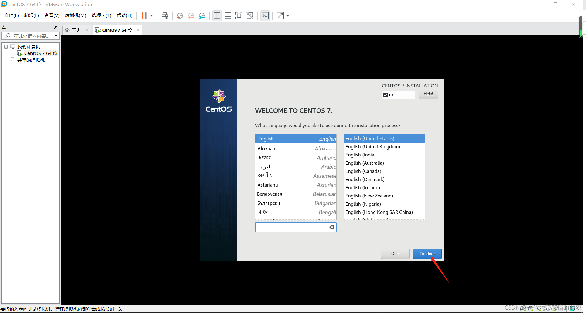 进入安装界面,选择 Install CentOS 7 ,启动安装 服务运行一会 出现语言选择界面,可以选择中文,建议选择英文,然后点击 Continue