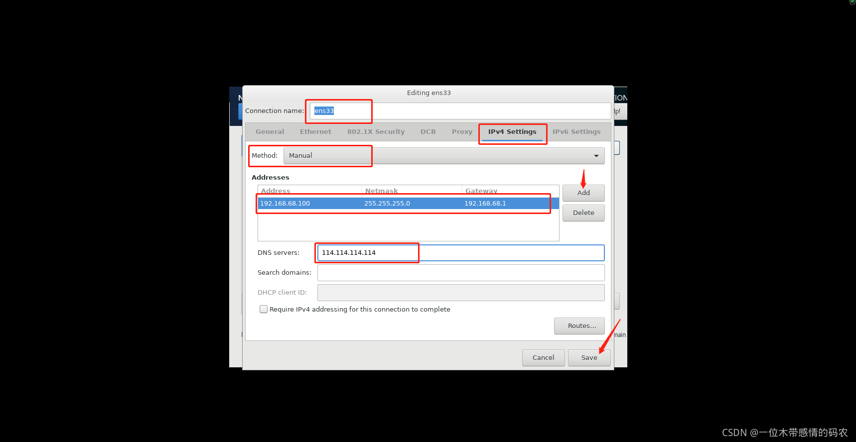 设置连接名,网络类型选择 IPv4,点击 Add,添加具体的网络配置,添加DNS,点击确认