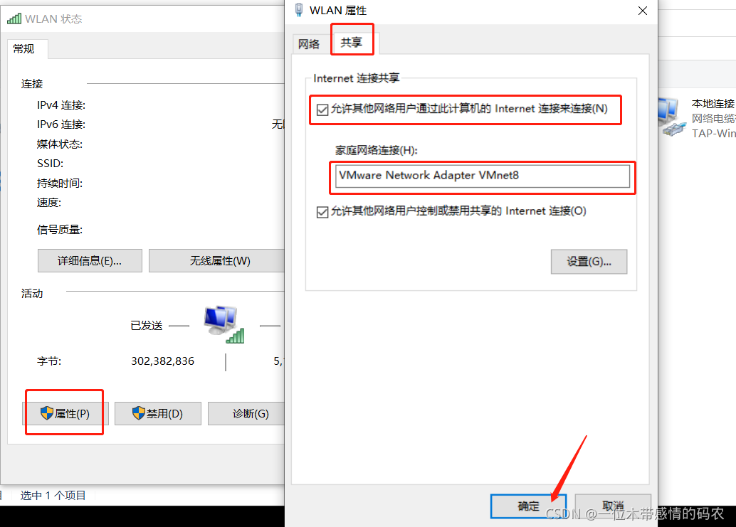 点击属性,再点击共享,勾选允许其他网络用户,选择 VMnet8,点击确认