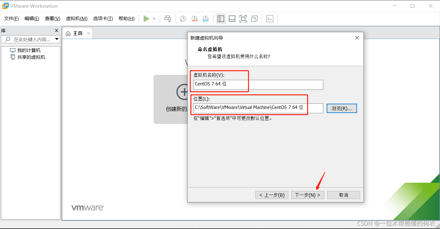 编写虚拟机名称——指定虚拟机安装位置——点击下一步