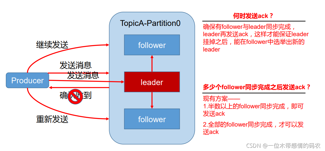 为保证 producer 发送的数据,能可靠的发送到指定的 topic,topic 的每个 partition 收到producer 发送的数据后,都需要向 producer 发送 ack(acknowledgement 确认收到),如果 producer 收到 ack,就会进行下一轮的发送,否则重新发送数据。