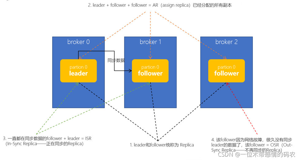 - 所有与leader副本保持一定程度同步的副本(包括 leader 副本在内)组成 「ISR」(In-Sync Replicas——在同步中的副本)