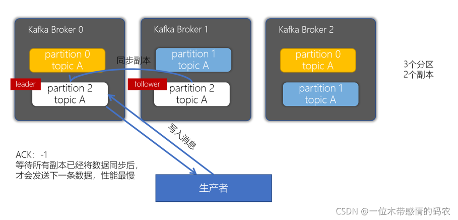 -1(all):producer 等待 broker 的 ack,partition 的 leader 和 follower 全部落盘成功后才返回 ack