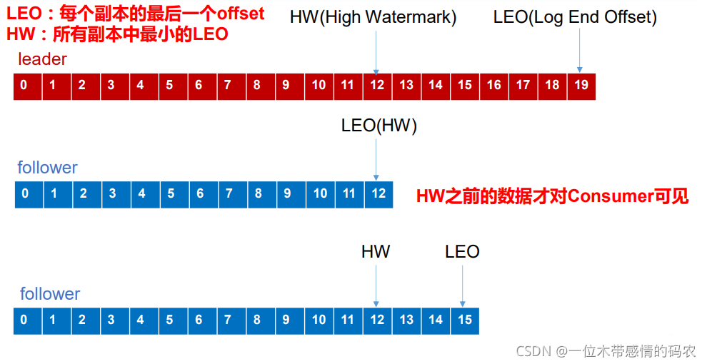 HW:指的是消费者能见到的最大的 offset,ISR 队列中最小的 LEO