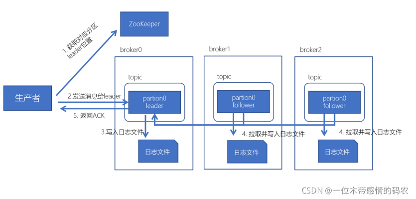 - 生产者先从 zookeeper 的 "/brokers/topics/主题名/partitions/分区名/state"节点找到该 partition 的 leader