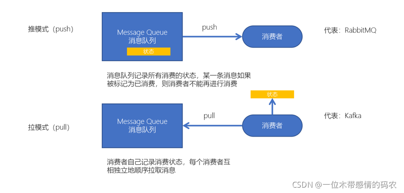- kafka 采用拉取模型,由消费者自己记录消费状态,每个消费者互相独立地顺序拉取每个分区的消息