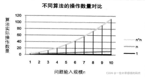 可以从问题描述中得到启示,同样问题的输入规模是n,求和算法的第一种,求1+2+…+n需要一段代码运行n次。那么这个问题的输入规模使得操作数量是f(n)= n,显然运行 100 次的同一段代码规模是运算 10 次的 10 倍。而第二种,无论n为多少,运行次数都为 1,即f(n)=1;第三种,运算100次是运算 10 次的 100 倍。因为它是f(n)=n^2^