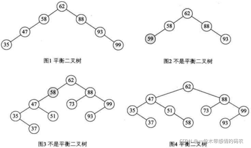 看下图,为什么图 1 是平衡二叉树,而图 2 却不是呢?这里就是考查我们对平衡二叉树的定义的理解,它的前提首先是一棵二叉排序树,图 2 的 59 比 58 大,却是 58 的左子树,这是不符合二叉排序树的定义的。图 3 不是平衡二叉树的原因就在于,结点 58 的左子树高度为 2,而右子树为空,二者差大于了绝对值 1,因此它也不是平衡的。而经过适当的调整后的图 4,它就符合了定义,因此它是平衡二叉树。