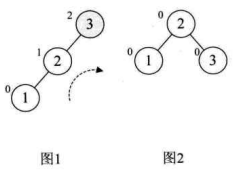 对于数组a[10]={3,2,1,4,5,6,7,10,9,8}的前两位 3 和 2,我们很正常地构建,到了第 3 个数 “1” 时,发现此时根结点 “3” 的平衡因子变成了 2,此时整棵树都成了最小不平衡子树,因此需要调整,如下图的图 1(结点左上角数字为平衡因子BF值)。因为BF值为正,因此我们将整个树进行右旋(顺时针旋转),此时结点 2 成了根结点,3 成了 2 的右孩子,这样三个结点的BF值均为 0,非常的平衡,如下图的图 2 所示。