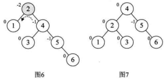 继续,增加结点 6 时,发现根结点 2 的BF值变成了 -2,如下图的图 6。所以我们对根结点进行了左旋,注意此时本来结点 3 是 4 的左孩子,由于旋转后需要满足二叉排序树特性,因此它成了结点 2 的右孩子,如图 7。增加结点 7,同样的左旋转,使得整棵树达到平衡,如图 8 和图 9 所示。