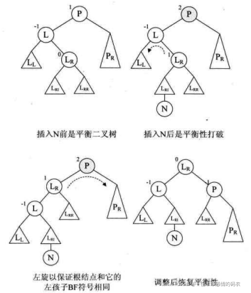 L的平衡因子为RH,即为 -1 时,表明它与根结点的BF值符号相反,此时需要做双旋处理。第 13~22 行,针对L的右孩子 L 的BF作判断,修改根结点T和L的BF值。第 24 行将当前 L 的BF改为 0。 - 第 25 行,对根结点的左子树进行左旋,如下图第二图所示。