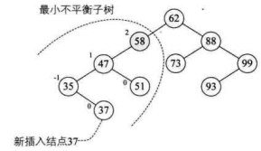 距离插入结点最近的,且平衡因子的绝对值大于1的结点为根的子树,我们称为最小不平衡子树。下图中,当新插入结点 37 时,距离它最近的平衡因子绝对值超过 1 的结点是 58(即它的左子树高度 2 减去右子树高度 0),所以从 58 开始以下的子树为最小不平衡子树。