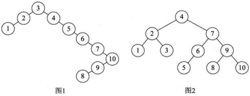为了能在讲解算法时轻松一些, 我们先讲一个平衡二叉树构建过程的例子。假设我们现在有一个数组a[10]={3,2,1,4,5,6,7,10,9,8}需要构建二叉排序树。在没有学习平衡二叉树之前,根据二叉排序树的特性,我们通常会将它构建成如下图的图 1 所示的样子。虽然它完全符合二叉排序树的定义,但是对这样高度达到 8 的二叉树来说,查找是非常不利的。我们更期望能构建成如下图的图2的样子,高度为 4 的二叉排序树才可以提供高效的查找效率。那么现在我们就来研究如何将一个数组构建出图 2 的树结构。