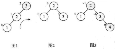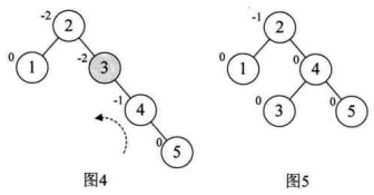 然后我们再增加结点 4,平衡因子没发生改变,如图 3。增加结点 5 时,结点 3 的BF值为 -2,说明要旋转了。由于BF是负值,所以我们对这棵最小平衡子树进行左旋(逆时针旋转),如图 4,此时我们整个树又达到了平衡。