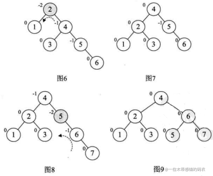 这样我们再以结点 7 为最小不平衡子树进行左旋,得到下图的图 13。接着插入 8,情况与刚才类似,结点 6 的BF是 -2,而它的右孩子 9 的BF是 1,如图 14,因此首先以 9 为根结点,进行右旋,得到图 15,此时结点 6 和结点 7 的符号都是负,再以 6 为根结点左旋,最终得到最后的平衡二叉树,如下图的图 16 所示。