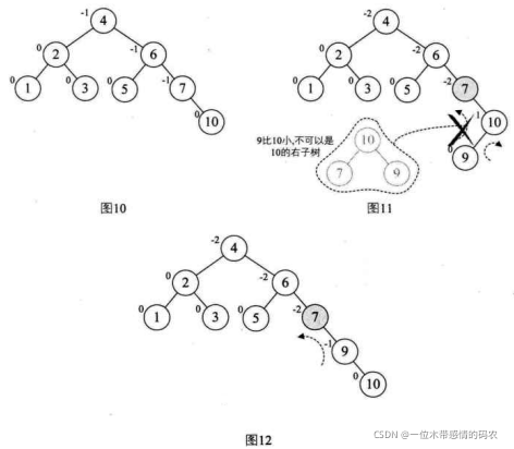 当增加结点 10 时,结构无变化,如下图的图 10。再增加结点 9,此时结点 7 的BF变成了 -2,理论上我们只需要旋转最小不平衡子树 7、9、 10 即可,但是如果左旋转后,结点 9 就成了 10 的右孩子,这是不符合二叉排序树的特性的,此时不能简单的左旋,如图 11 所示。
