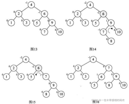 不统一,不统一就把它们先转到符号统一再说, 于是我们先对结点 9 和结点 10 进行右旋,使得结点 10 成了 9 的右子树,结点 9 的BF为 -1,此时就与结点 7 的BF值符号统一了, 如上图的图 12 所示。