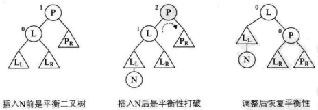 L的平衡因子为LH,即为 1 时,表明它与根结点的BF值符号相同,因此,第 8 行,将它们的BF值都改为 0,并且第 9 行,进行右旋操作。操作的方式如本节的图 1 、图 2 所示。 - 当