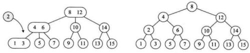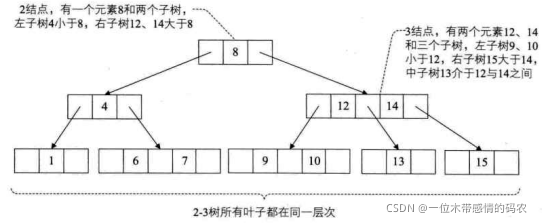 一个2结点包含一个元素和两个孩子(或没有孩子),且与二叉排序树类似,左子树包含的元素小于该元素,右子树包含的元素大于该元素。不过,与二叉排序树不同的是,这个 2 结点要么没有孩子,要有就有两个,不能只有一个孩子。