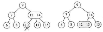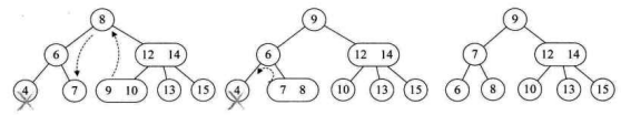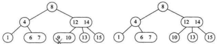 - 所删除的元素位于非叶子的分支结点。此时我们通常是将树按中序遍历后得到此元素的前驱或后继元素,考虑让它们来补位即可。