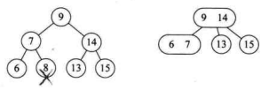 情形四,如果当前树是一个满二叉树的情况,此时删除任何一个叶子都会使得整棵树不能满足 2-3 树的定义。如下图所示,删除叶子结点 8 时(其实删除任何一个结点都一样),就不得不考虑要将 2-3 的层数减少,办法是将 8 的双亲和其左子树 6 合并为一 3 个结点,再将 14 与 9 合并为 3 结点,最后成为右图的样子。