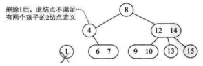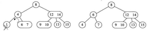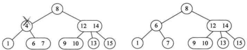 如果我们要删除的分支结点是 2 结点。如下图所示我们要删除 4 结点,分析后得到它的前驱是 1 后继是 6,显然,由于 6、7 是 3 结点,只需要用 6 来补位即可,如下图右图所示。