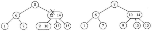 如果我们要删除的分支结点是 3 结点的某一元素,如下图所示我们要删除 12、14 结点的 12,此时,经过分析,显然应该是将是 3 结点的左孩子的 10 上升到删除位置合适。