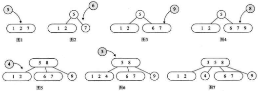 由于 2-3-4 树和 2-3 树是类似的,这里就简单介绍一下,如果我们构建一个数组为 {7,1,2,5,6,9,8,4,3} 的 2-3-4 树的过程,如下图所示。图 1 是在分别插入 7、1、2 时的结果图,因为 3 个元素满足 2-3-4 树的单个4结点定义,因此此时不需要拆分,接着插入元素 5,因为已经超过了 4 结点的定义,因此拆分为图 2 的形状。之后的图其实就是在元素不断插入时最后形成了图 7 的 2-3-4 树。