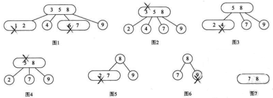 下图是对一个 2-3-4 树的删除结点的演变过程,删除顺序是 1、6、3、4、5、2、9。